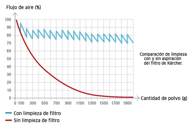 Gracias a la función de limpieza del filtro integrada, los filtros sucios de los equipos de categoría superior de la serie MV 5-6 pueden limpiarse de forma rápida y eficaz con solo pulsar el botón de limpieza. De este modo, puede trabajar con una potencia de aspiración constantemente alta incluso en tareas de limpieza difíciles (véase el gráfico).