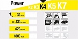 El rendimiento de limpieza de una limpiadora de alta presión resulta de la combinación entre cantidad y presión del agua. Cuanto más óptimamente adaptados estén ambos factores, tanto más fácil será desprender la suciedad incrustada y tanto más rápidamente se podrán limpiar superficies grandes. Atendiendo a las diferentes necesidades de limpieza, Kärcher asigna sus equipos a clases de potencia determinadas. Cuanta más superficie deba limpiarse, o cuanto más incrustada esté la suciedad, más alta será la clase de potencia recomendada.