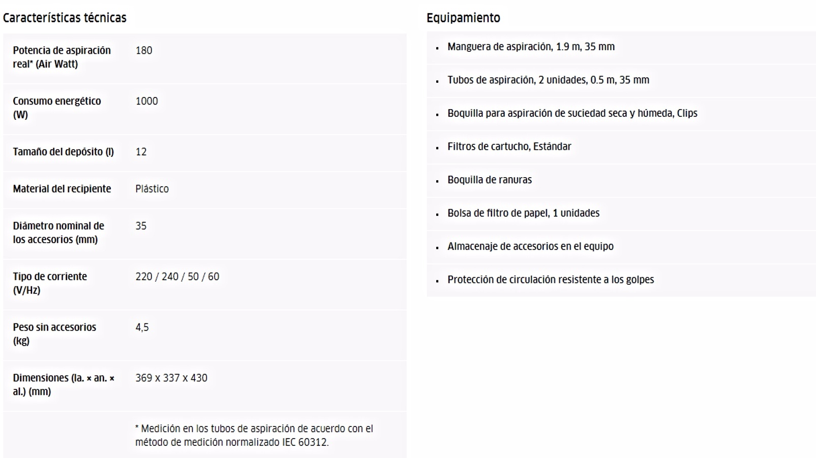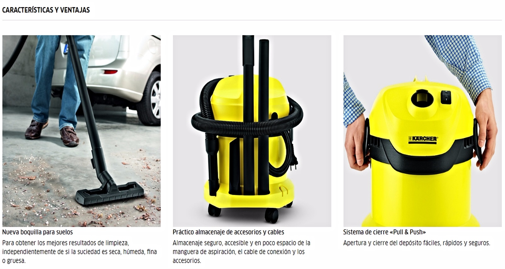 El modelo WD 2 Cartridge Filter Kit es aspirador multiuso compacto, potente, con un consumo eléctrico de tan solo 1000 W. El equipamiento contiene un robusto depósito de plástico de 12 l de volumen útil resistente a los golpes y un filtro de cartucho para aspirar suciedad seca y húmeda sin cambiar el filtro. El aspirador está provisto de una innovadora boquilla para suelos con clips para uso mixto, para así poder recoger de forma óptima todo tipo de suciedad. Otras características del equipo: sistema de cierre «Pull & Push», asa de transporte con diseño ergonómico y un práctico almacenaje de accesorios y cable en el equipo.