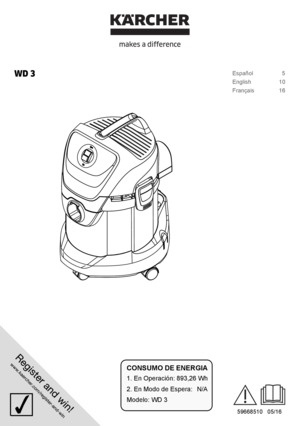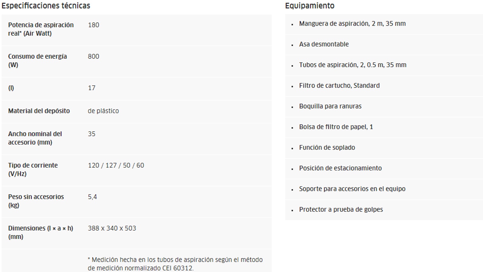 La WD 3 es una aspiradora multi-propósito muy eficiente y cuyo consumo de sólo 900 watts, le permite obtener resultados tan buenos como una aspiradora de 1200 watts. Con un robusto contenedor a prueba de impactos de 17 litros, esta aspiradora compacta ofrece muchas ventajas adicionales como: versatilidad de aplicaciones, diseño compacto para un fácil y rápido almacenamiento, entre otros. La WD 3 es ideal para la limpieza ocasional del interior del hogar, sótano, área exterior, así como el interior de los vehículos y puede aspirar pequeñas cantidades de agua.